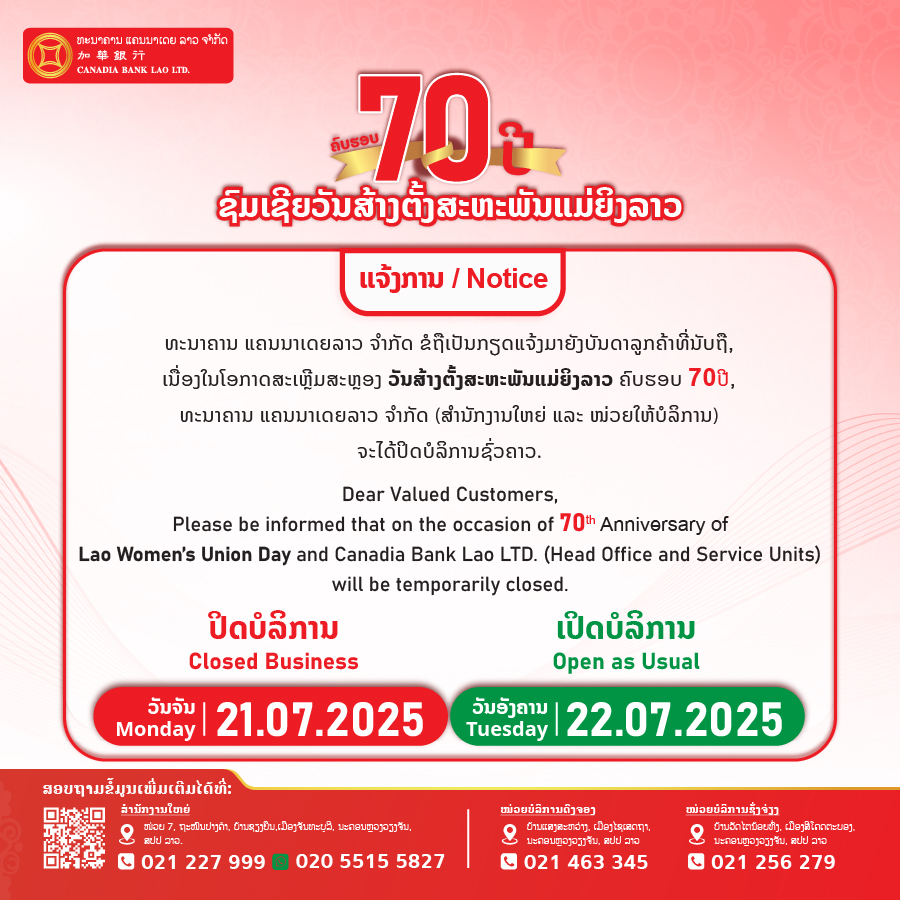 Dear Valued Customers, please be informed that on the occasion of 70th Anniversary of Lao Women’s Union Day and Canadia Bank Lao LTD. (Head Office and Service Units) will be temporarily closed.