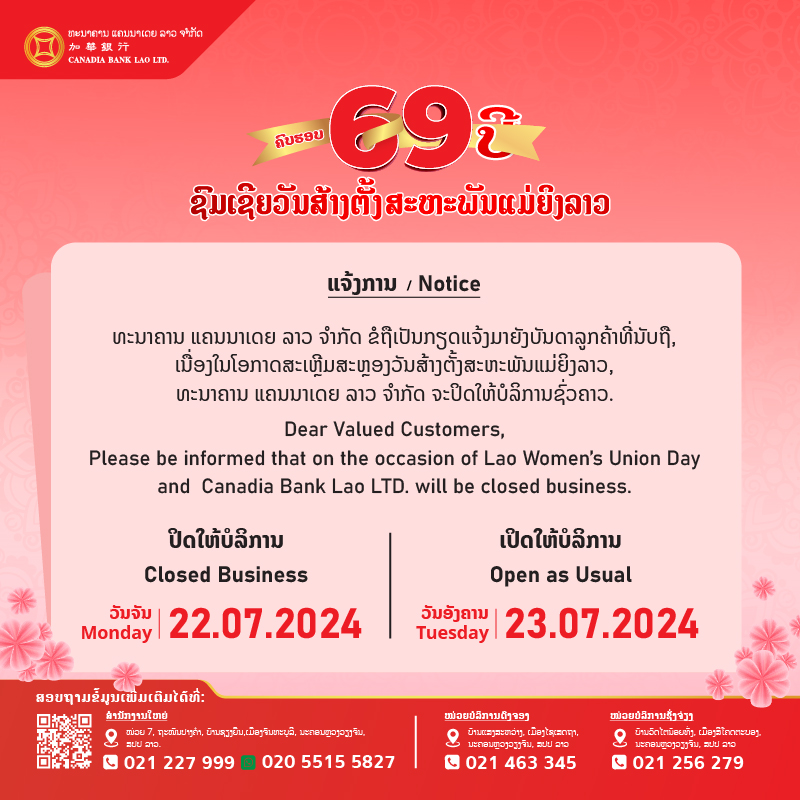 ທະນາຄານ ແຄນນາເດຍ ລາວ ຈຳກັດ ຂໍຖືເປັນກຽດແຈ້ງມາຍັງບັນດາລູກຄ້າທີ່ນັບຖື, ເນື່ອງໃນໂອກາດສະເຫຼີມສະຫຼອງວັນສ້າງຕັ້ງສະຫະພັນແມ່ຍິງລາວ, ທະນາຄານ ແຄນນາເດຍ ລາວ ຈຳກັດ ຈະປິດໃຫ້ບໍລິການຊົ່ວຄາວ. ປິດໃຫ້ບໍລິການ: ວັນຈັນ ວັນທີ 22/07/2024 ແລະ ເປິດໃຫ້ບໍລິການ: ວັນອັງຄານ ວັນທີ 23/07/