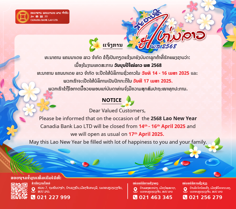 ເນື່ອງໃນງານເທດສະການ ວັນບຸນປີໃໝ່ລາວ ພສ 2568 ທະນາຄານ ແຄນນາເດຍ ລາວ ຈຳກັດ ຈະປິດໃຫ້ບໍລິການຊົ່ວຄາວໃນ ວັນທີ 14 - 16 ເມສາ 2025 ແລະ ພວກເຮົາຈະເປີດໃຫ້ບໍລິການເປັນປົກກະຕິໃນ ວັນທີ 17 ເມສາ 2025. ພວກເຮົາຂໍຖືໂອກາດນີ້ອວຍພອນແກ່ບັນດາທ່ານຈົ່ງມີຄວາມສຸກສົມປາຖະໜາທຸກປະການ.